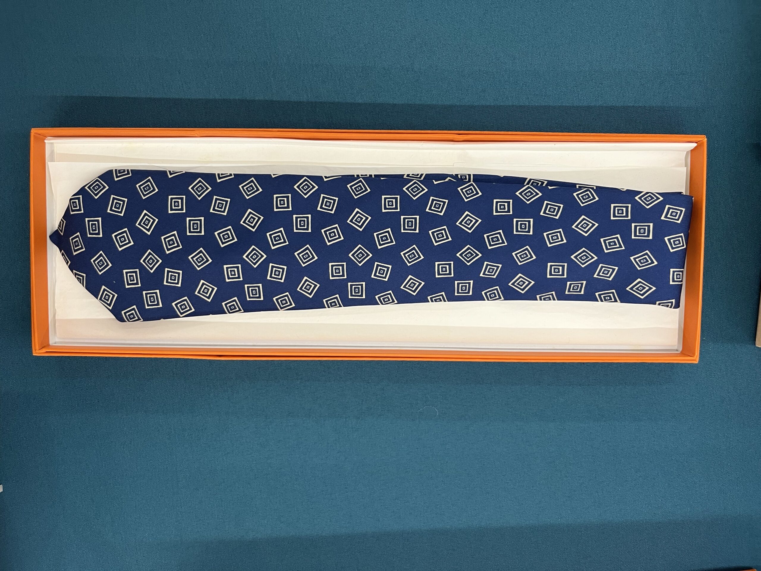 Hermes silk tie Elegant Hermes tie, in beautiful navy blue/lightblue/red background. In excellent preloved condition. No flaws. Excellent for formal or business wear. Comes with Hermes tie box so makes an excellent gift.